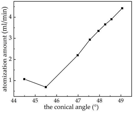 From Equation (13), the change in atomization amount with conical angle can be obtained, as shown in Figure 10. The atomization amount basically increases with the increase in electrolytic polishing time, indicating that the theoretical analysis is consistent with the experimental results. When the conical angle is 48,267° (the polishing time is 5 min), the atomization amount reaches the maximum value of 5.202 mL/min.