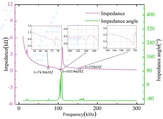 Figure 8 shows the frequency sweep curve of piezoelectric atomizers. The resonant frequencies of the piezoelectric atomizers measured by the experiment are 75, 104, 155, 159, and 164 kHz. When the working frequency exceeds 150 kHz, the piezoelectric ceramics will have violent vibrations while working, which will not only greatly reduce their service life, but may also lead to atomization sheet breakage. Therefore, working frequencies exceeding 150 kHz will not be considered in the experiment. When the frequency is 75 kHz, the piezoelectric ceramics have a certain vibration velocity. However, because the vibration amplitude in the center area of the distribution of the micro-tapered holes is small, the change in the volume of the micro-tapered holes can be almost negligible. Basically, no dynamic conical angle effect will be formed, and only slight atomization will occur at this time. Based on experimental comparison, the driving frequency is 104 kHz in this experiment.