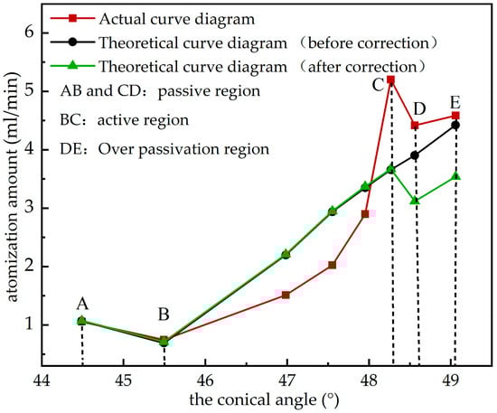 According to Equation (12) and the measured data in the experiment, because it is not known how long the electrolytic polishing time t will be, Z will significantly change. Hence, Z will be temporarily treated as a constant and then corrected in accordance with the atomization experiment. A diagram of the relationship between the conical angle and atomization amount is shown in Figure 7. When the electrolytic polishing time is 1 min, the atomization amount decreases somewhat. Nonetheless, overall, the atomization amount Q increases with the increase in electrolytic polishing time t.
