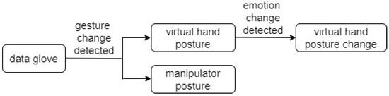 Liapis et al. [45] identified specific stress regions in the valence-arousal space by combining pairs of valence-arousal and skin conductance for 31 volunteers. The findings showed which regions in the valence-arousal rating space could express self-reported stress in accordance with the subject’s skin conductance. They also presented a new method for the empirical discrimination of emotion regions in the valence-arousal space. Feng et al. [46] proposed an automated method of classifying emotions for children using EDA. The results quantitatively indicated that the proposed method could significantly improve emotion classification using wavelet-based features. van der Zwaag [47] selected songs with the most increased or decreased skin conductance levels in 10 subjects to cause an energetic or calm motion based on the resulting user models. The results indicated that the effect of a song on skin conductance could be reliably predicted, and skin conductance that could kept in certain state for at least 30 min was directly related to energetic or calm mood. It was feasible to reflect the emotional response of listeners through physiological signals. Lin et al. [48] studied the application of data gloves with two systems: one was a system of emotion recognition and judgment that was built based on the optimal features of EDA, and another was a system of virtual gesture control and a manipulator propelled by emotion, as shown in Figure 1. The test results for five subjects showed that the system could regulate the gestures of a virtual hand through reading the signals of skin electricity when the subjects did not change any gesture, and the manipulator could complete the steering change driven by emotion as shown in Figure 2, where the bottom row is the duration of the music, the middle row is the EDA signals of subjects after listening to music, and the top row is the manipulator steering change driven by emotion based on the EDA signals.