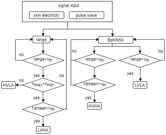 Liu et al. [77] presented an approach to determine operators’ emotional states attributed to a set of CAD design tasks based on EEG, galvanic skin resistance, and ECG signals. The stimulation and interpretation of each operator’s emotions were performed successfully, through various task action chains, with obvious correlations confirmed between the operator’s CAD experience and their emotional states. Pinto et al. [78] processed ECG, EMG and EDA signals with unimodal and multimodal methods to develop a physiological model of emotions in 55 subjects. The results showed that the ECG signal was the best in emotion classification, and fusion of all signals could provide the most effective emotion identification. Zhuang et al. [79] developed a novel approach for valence-arousal model emotion assessment with multiple physiological signals to determine human emotional states using various algorithms. It was found that the deep neural network approach could precisely identify human emotional states. Garg et al. [80] presented a model using a machine learning method for the calibration of the mood of the song according to audio signals and human emotions based on EEG, ECG, EDA and pulse wave signals. They performed extensive experiments using songs that induced different moods and emotions and tried to detect emotions with a certain degree of efficiency and accuracy. Zhuang et al. [81] built a system of emotion recognition based on the EEG, ECG and EMG signals and used the T method of the Mahalanobis–Taguchi system to handle the signals and further identify emotional states. The results indicated that, although the T method only modified the accuracy on the valence state, it still identified the emotion intensity in different states. Lin et al. [82] studied a model of emotion recognition and judgment based on ECG, EDA, facial EMG and pulse wave signals monitored in 40 subjects playing a computer game. The subjects were required to complete a questionnaire including typical scenarios appearing in the game and subjects’ evaluations of the scenarios. Relationships between the signal features and emotion states were established with a statistical approach and the questionnaire responses. They obtained a set of optimal features from the physiological EDA and pulse wave signals, reduced the dimensionality features, chose features with a significance of 0.01 according to the relationship between the features and emotional states, and finally built a model of emotion recognition and judgment as shown in Figure 3, where BpNN50 means percentage of main wave interval > 50 ms, 1dmean is the mean value of first-order difference, HVLA is high valence-low arousal, LVHA is low valence-high arousal, HVHA is high valence-high arousal and LVLA is low valence-low arousal.