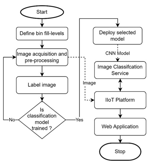 This work presents a novel computer vision system that can automatically recognize the fill level of industrial waste containers with metal scrap. The fill pattern may differ in terms of waste location within a container, geometry and shape of the waste, and relative position compared to the optical sensor (camera). The proposed approach can classify the fill level in different categories by capturing RGB images of the waste containers and applying them as input to a pre-trained CNN model that executes the classification task. The results of the fill-level estimation process are managed by an IIoT platform and visualized in a user-friendly web application. In Figure 1 the flow diagram of the proposed method is presented.