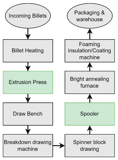 The method presented in Chapter 2 has been applied in an industrial pilot in the production line of a copper tube plant. In Figure 2, the process plan of the copper tube production under study is presented. The process starts with copper billets being preheated before entering the hot extrusion press to produce the “mother” tube. These tubes, which have an initial length of 15 to 30 m, are then reduced in diameter and wall thickness by either drawing or cold rolling processes. Further reductions are then performed at Breakdown lines and Spinner Blocks by drawing the tube further with successive passes, till the final or semi-final dimension is reached. In the spoolers’ workstations, the copper pipe is formed in coils, to be forwarded for annealing to the Bright Annealing Furnaces and then for insulation with polyethylene foam. The final step of the production is the packaging and storing of tubes.