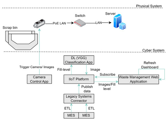 - IIoT platform, image classification service and web application: The trained model is deployed within an Image Classification Service that runs on the services layer of a digital IIoT platform. The layered architecture proposed in [2] and adapted in [6] has been adopted in this work for integrating the different layers from factory-level edge devices (cameras) to IIoT platforms and Web applications. The adopted layered architecture allows for structured deployment of software components and hardware devices both at the edge and the cloud, while at the same time the integration among the different layers is based on clearly defined roles and interfaces. Images captured by the computer vision system are populated through IoT protocols such as Message Queuing Telemetry Transport (MQTT) or Representational State Transfer Application Programming Interface (REST API) function calls to the IIoT platform. Through a publish-subscribe mechanism, new images trigger the call of the Image Classification Service that classifies each new image to one of the fill levels and stores this information back to the IoT platform. A web application is linked to the IIoT platform for providing end-user functionality such as dashboards with bin-level statuses and trendlines.