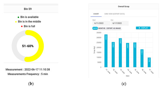 Figure 5. Visualization components of the dashboard: (a) Bin fill level over time, (b) Current bin-fill level, and (c) Scrap generation over time.
