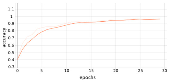 - Training and evaluation of CNN model: By the time a sufficient number of images is collected, open-source DL models for image classification, such as VGG16, that are already trained in huge image datasets such as ImageNet [19] are customized and retrained on the labelled images. The captured images are resized for fitting to the input dimension of the CNN models (in the industrial pilot of this study a 224 × 224 resizing of the images took place). The accuracy and loss of the CNN model during training and evaluation are calculated. Accuracy depicts the number of correct model predictions of the overall predictions while loss provides the difference between the expected outcome and the outcome produced by the CNN model. The training accuracy represents the accuracy of the model at fitting the data. Validation accuracy represents an unbiased metric on how well the model fits the training data while finetuning the model’s hyperparameters. The accuracy is calculated based on the following Formula (1):where: