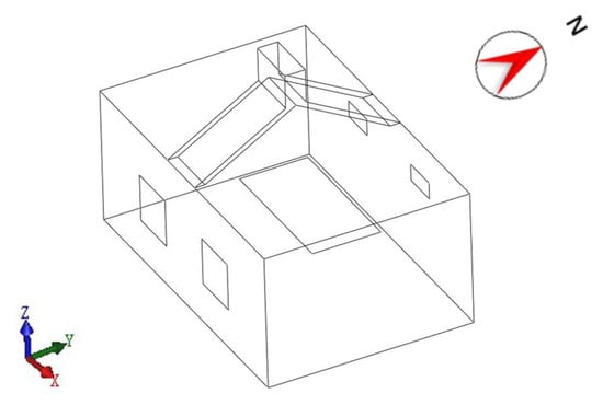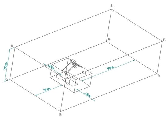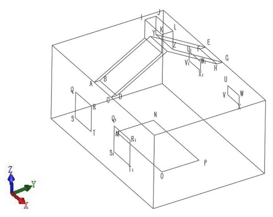 The calculation area for the solar chimney building is shown in Figure 2. The geometry of the room is 9000 × 6000 × 4000 mm. The geometry of the indoor heat source is 4000 × 2000 mm and is located in the center of the room. The south wall of the room is provided with two 1400 × 1400 mm windows QRST, Q1R1S1T1. Spaced at 3400 mm centers, with their lower edges 1200 mm from the floor. The north wall of the room is provided with UVWX, U1V1W1X1 two windows of 1000 × 500 mm with a center spacing of 3400 mm and their lower edge at 2500 mm from the floor. ABCD and EFGH are the inlet of the chimney with a geometry of 1500 × 300 mm. IJKL is the outlet of the chimney, with a geometry of 1500 × 600 mm. The angle between the inclined chimney section and the horizontal direction is 30°, and the height of the vertical chimney section LZ is 1000 mm. The size of the numerical simulation calculation domain is determined according to the building guidelines. The side and top boundaries are 18, 18, and 30 m from the building, respectively. Wind speed inlet A1B1C1D1 is 30 m from the building, and in order for the building’s wake to fully develop, wind speed outlet E1F1G1H1 is 60 m from the building.