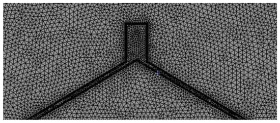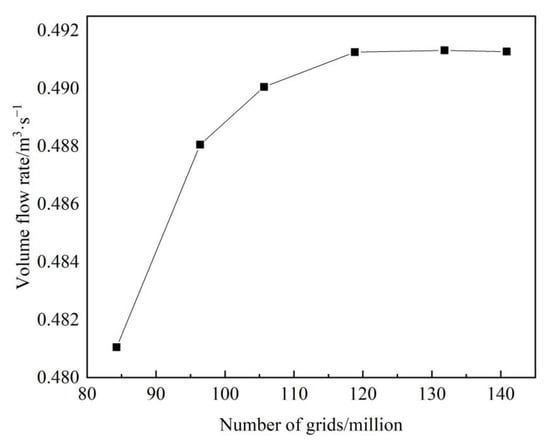 The calculations are complicated by the presence of outdoor wind fields and solar chimneys in the calculation area. Structured and unstructured grids are used to divide the model. To ensure the accuracy of the calculation results a grid encryption is used near the heat source and the chimney channel. The local encryption calculation grid is shown in Figure 3. The grid independence is assessed during the calculation and simulation to generate six sets of grids, the grid numbers are 842,790, 963,847, 1,056,646, 1,188,238, 1,318,472, and 1,408,494, and the values of natural ventilation under different grids are shown in Figure 4. The deviation between the ventilation values of the 4th and 5th grids is only 1%, and the 4th grid is chosen for the numerical simulation due to the accuracy of the results and the speed of calculation.