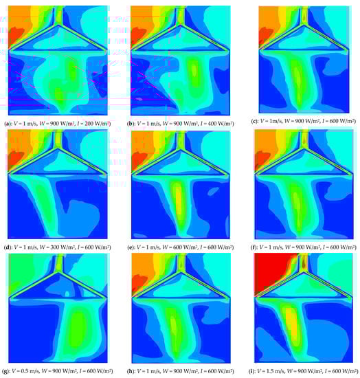 The air velocity distribution inside the solar chimney building at X = 4.5 m is shown in Figure 6, where W is the heat flow density of the internal heat source; V is the outdoor wind speed; I is the solar radiation intensity; and the geometry of the internal heat source is 4000 × 2000 mm.