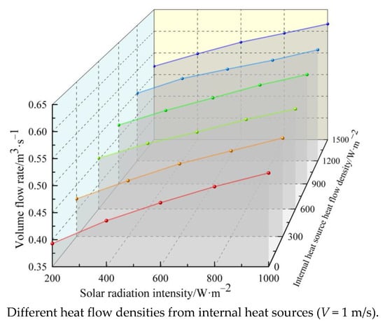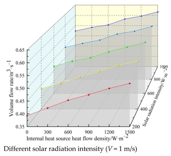 Figure 7 shows the variation curve of solar chimney ventilation with solar radiation intensity at different internal heat source heat flow densities, where: internal heat source heat flow density W is 0–1500 W/m2; solar radiation intensity I is 200–1000 W/m2; internal heat source geometry size is 4000 × 2000 mm.