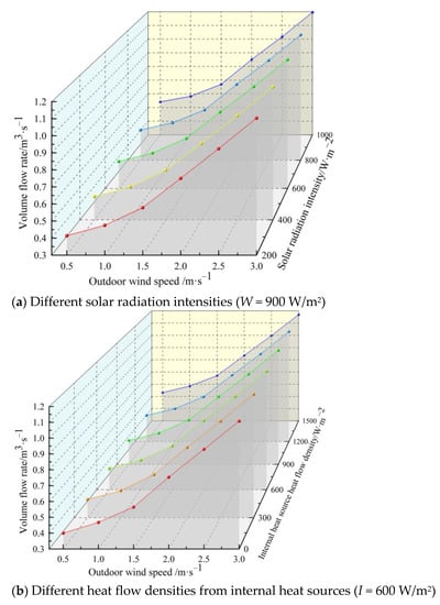 Figure 9a,b shows the variation curves of solar chimney ventilation with outdoor wind speed V for different solar radiation intensities and heat flow densities of indoor heat sources. The outdoor wind speed is taken to be 0.5 to 3.0 m/s.