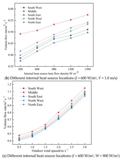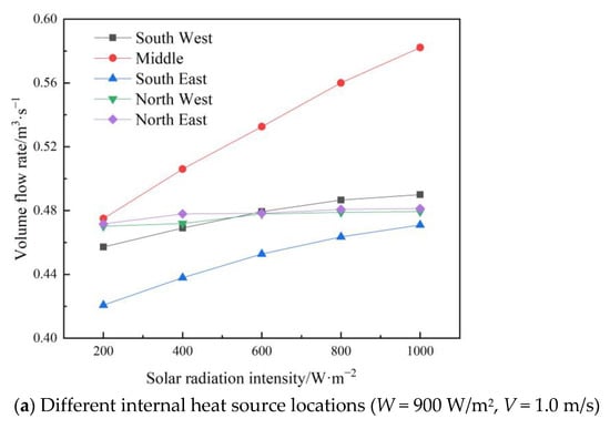 As can be seen from Figure 11a, when the internal heat source W = 900 W/m2 and the outdoor wind speed V = 1.0 m/s, the solar chimney ventilation volume increases with the increase in solar radiation intensity for the heat sources located in the southwest, southeast, and middle directions, with increases of 7.2, 11.9, and 22.6%, respectively. When the heat source is located in the northwest and northeast, the solar chimney ventilation volume does not change much as the solar radiation intensity increases.