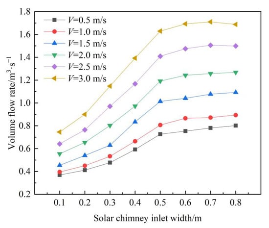 Variation of ventilation volume with solar chimney inlet width.