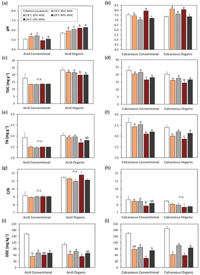 After a 6-month incubation, a decrease in TOC was observed in almost all soil samples (Figure 1c,d), except for the acid conventional soil, where the TOC content did not change with all stress treatments. Soil organic matter can sometimes be unavailable for microbial decomposition when it is physically protected by the formation of aggregates where oxygen and enzyme diffusion is restricted, and when it is chemically protected by adsorption to mineral surfaces [51]. This fact was also demonstrated in a field study where the temperature sensitivity of soil organic matter decomposition decreased with increasing stability [52]. Regardless of acid conventional soil, the decrease in TOC was detected and was greatest in almost all soil samples when incubated at higher temperatures (29 °C) but at optimal moisture (40% WHC). The largest decrease was observed in calcareous conventional soil (almost 20%). Moisture stress, in contrast, reduced TOC decomposition in calcareous soils and was ineffective in acid soils (Figure 1c,d). The temperature sensitivity of soil respiration determined in laboratory soil incubations showed a significant decrease with increasing average incubation temperature observed in soils of all ecosystems with a sufficiently wide range of incubation temperatures [29]. These results are consistent with incubation experiments [53], where soil organic matter decomposition rates were greatly reduced at low and high soil moisture levels, while decomposition rates were increased at intermediate temperatures and moisture levels.