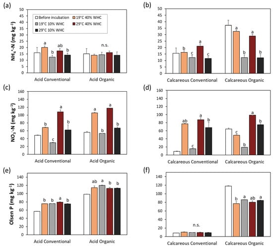 Ammoniacal and nitric nitrogen and Olsen P in soils before and after 6 months’ incubation under no stress (19 °C and 40% WHC), moisture (19 °C and 10% WHC), temperature (29 °C and 40% WHC), and combined stresses (29 °C and 10% WHC). Different letters denote significant differences between treatments within each soil type and management, according to Tukey’s multiple comparison test (p < 0.05).