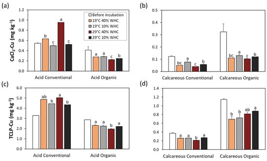 Bioavailability (a,b) and leaching (c,d) of Cu in soils before and after 6 months’ incubation under no stress (19 °C and 40% WHC), moisture (19 °C and 10% WHC), temperature (29 °C and 40% WHC), and combined stresses (29 °C and 10% WHC). Different letters denote significant differences between treatments within each soil type and management, according to Tukey’s multiple comparison test (p < 0.05).