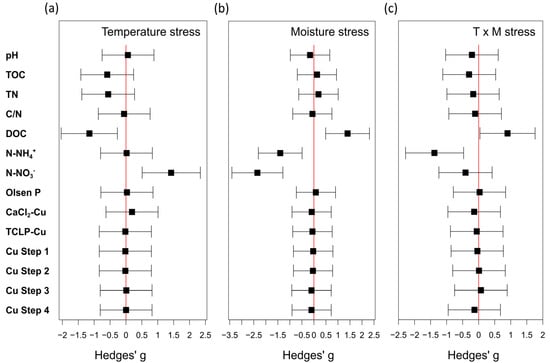 Changes of soil properties due to temperature stress (a), moisture stress (b), or their combination (c). Effect sizes (g) lower than 0.2 are considered not meaningful. Positive or negative mean effect sizes indicate an increase or a decrease of the soil property after the stress, respectively. Changes are shown using forest plots of mean effect sizes, based on Hedges’ g index.