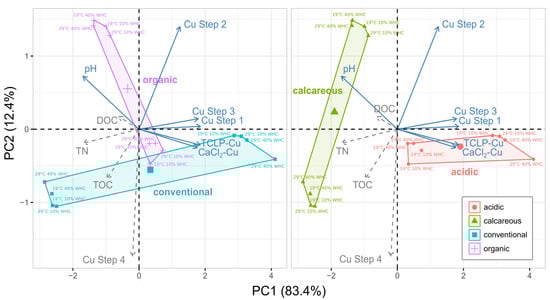 In addition, there is a clear separation of the four soils, either for their management (conventional vs. organic) or for their pH (acid vs. calcareous). Soil pH, in particular, well defines the calcareous and acidic groups. pH is, in fact, one of the main driving factors affecting most soil properties [49], and it consistently affects the ordination. It also explains why points related to the different imposed stress treatments but belonging to the same soil are closely located in the PCA.