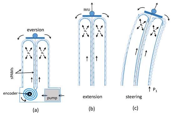 Working principal of the growing vine robot. (a) Air pressure is applied to the robot’s core tube to facilitate the tip extension in (b). Steering in (c) is carried out by varying the air pressure in one or two of the sPAMs placed around the vine robot.