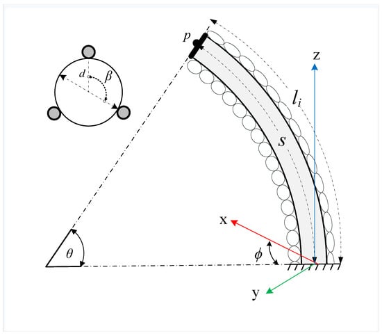 To obtain the vine-robot’s forward kinematic model, the constant-curvature assumption is commonly used [20]. The vine-like robot is considered a one-section extensible continuum-like robot where two degrees of freedom are responsible for the robot’s curvature and bending, while another is for lengthening the robot. The pose of the robot’s distant tip to its base is determined in terms of the robot’s configurations ; this includes the robot’s length s, the curvature angle and the angle of curvature plan as illustrated in Figure 2. Thus, is obtained as follows: