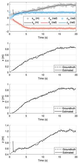 In vine robots, we assumed that the joint–space values, i.e., the robot length , the angle of curvature , and the plane angle , are measured at each k sample. As discussed in [15], the robot length is indirectly sensed using an incremental encoder placed on the shaft of the motor that holds the robot material. In addition, according to what has been proposed in [24], the robot angle of curvature and the plane angle could be anticipated from the tip quaternion that is measured using an Inertial Measurement Unit (IMU) place on the robot’s tip. Thus, to find the measurement model in (5), we assume that the robot’s output is measured at a sampled time with a T interval. Hence, with the help of the closed-form Inverse kinematic (IK) solution for one-section continuum robots proposed in [25], the measurement model is mainly depending on the tip Cartesian position and could be formulated as: