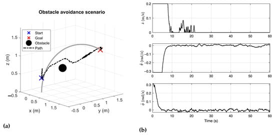 (a) The path generated by the proposed NMPC to reach a predefined goal of m while avoiding an obstacle with a known location; (b) the corresponding actuator inputs generated from the NMPC and applied to the vine-like robot.