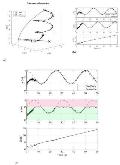 (a) The trajectory tracking performance of the proposed NMPC; (b) the corresponding state tracking in x, y and z coordinates. (c) The robot’s state in case of constraining the y-axis of the robot.