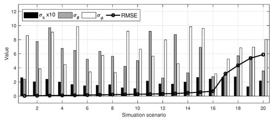 (Top) The RMSE results of the conducted Monte Carlo 20 simulation scenarios at various sensors’ noise levels.
