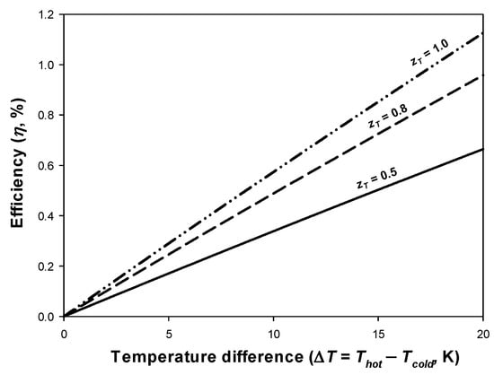 According to (4), the efficiency of a TEG depends on the hot and cold junction temperatures and on the thermoelectric properties of the material through the merit factor zT. However, (4) only predicts ηmax accurately for small temperature differences ∆T = Thot − Tcold, or for materials with zT almost constant over a wide temperature range [36]. In practical scenarios, the efficiency of a TEG can be more complex when considering the thermal and electrical resistances, heat leakage, Thompson effect, and the temperature gradient in the heat sinks at the hot and cold ends of the TEG [37].