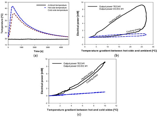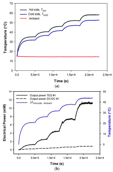 Figure 8a shows the evolution of the temperature with time of the hot side and the cold sides of TEG #1, while Figure 8b shows the evolution with time of the output electrical power of TEG # 1 and DC/DC converter #1.