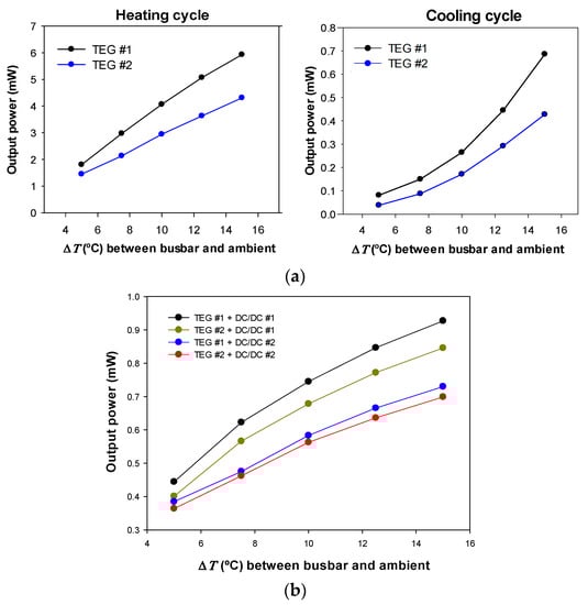 Figure 4 shows the performance of TEG #1 combined with DC/DC converter #1. According to Figure 4b,c, with the same temperature difference between the busbar and the ambient, more power is generated during the heating cycle than during the cooling cycle. This hysteresis response is mainly due to the delayed thermal diffusion from the ceramic plate to the hot junction of the TEGs [40].