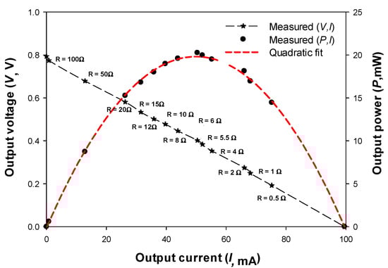 First, the characteristic voltage—current and power—current curves of TEG #1 were obtained by heating the busbar. The hot and cold side temperatures of the TEG were 67.7 °C and 57.8 °C, respectively, with an ambient temperature of 21.5 °C. This corresponds to a temperature gradient ∆T = Thot − Tcold ≈ 10 °C between the hot and cold sides of the TEG. During the tests, a variable resistor was connected between the terminals of TEG #1, and the voltage V and current I flowing through its terminals were measured. These values are shown in Figure 6 together with the P − I fit, where P = V·I.