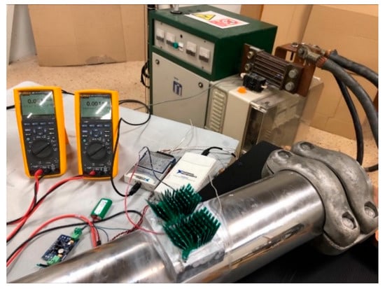 The tests were carried out indoors at an ambient temperature of about 20 °C. The TEGs were mounted on a flat rectangular aluminum busbar that was heated from room temperature to approximately 50 °C using a power supply and heating resistors, as shown in Figure 3. Next, to determine the performance of the devices during the cooling phase, the power supply was disconnected, whereby the aluminum bar cooled by natural convection. The electrical output power of the TEGs and DC/DC converters was determined by multiplying the respective voltages and currents.