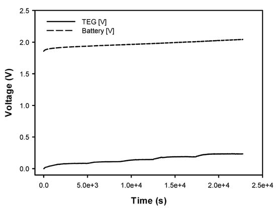Voltage generated by TEG #1 and the voltage across the battery during a cold start situation using the TEG #1 + DC/DC converter #1 combination.