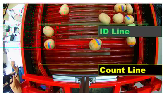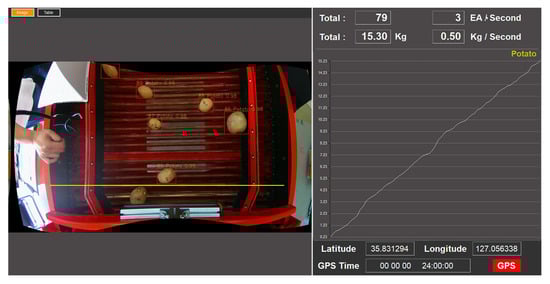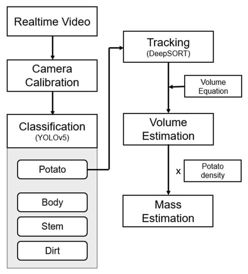- A system was developed that carries out potato object tracking and counting by applying YOLOv5, one of the deep learning algorithms, and DeepSORT, one of the object tracking algorithms, to the real-time image obtained by a camera installed on top of the potato harvester sorting unit, and this system estimates the mass of a detected potato by calculating its volume using the major axis and minor axis lengths of its bounding box and then multiplying this by the density.