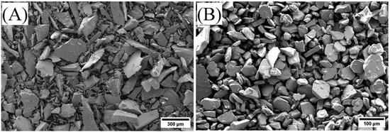 Geopolymer composites containing fifty-micron alumina platelets and glass particulates as seen in Figure 1 were manufactured, cured for seven days, and heated to 900 °C for five hours. The high angularity of these particles allows for a relatively higher average free space among particles [45]. This higher average free space among particles allows for the molten glassy phase to flow throughout the composite more easily at elevated temperatures once the matrix phase has uniformly shrunk [46]. This may seem counterintuitive as shrinking causes a reduction of space, however, the alumina phase remains rigid [36]. It can be theorized that capillary action and/or liquid phase sintering of the shrinking matrix phases drew in the softened, highly viscous glass particulates upon further heating [47,48,49].