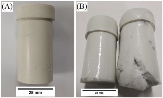 Figure 2 below shows crucibles before and after heating using slow (2.5 °C/min) and fast (10 °C/min) heating rates. A uniform high sheen glaze was observed among geopolymer composites that were heated at 2.5 °C/min to 900 °C for five hours; however, samples heated at 10 °C/min were nonuniformly deformed and did not form a uniform glaze. The increased volume in Figure 2B indicates an increase in porosity from the initial sample, which may have merit in other applications. In this study, however, uniform volume change after heating is a preliminary requirement for a suitable molten salt containment material. Therefore, only composites with a heating rate of 2.5 °C/min were used for salt containment testing.