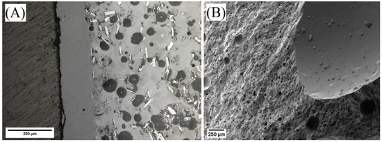 Micrographs of polished (A) and fractured (B) ASH-G composites after heating to 900 °C for 5 h using heating/cooling rates of 2.5 °C/min.
