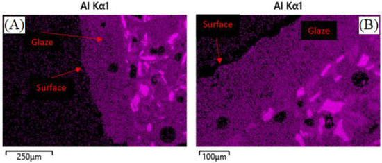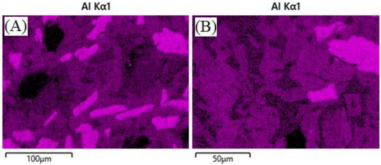 It can be hypothesized that the lack, or reduction, of the glaze, is due to some glassy phase material migrating into the bulk of the composite during reheating above the glass softening point of 573 °C, according to previous work [31]. EDS analysis of geopolymer composites in Figure 6 and Figure 7 show the lack, or presence, of surface glaze via aluminum concentration. Areas of brighter purple indicate higher aluminum content and dimmer areas indicate lower aluminum content. Figure 8 shows lighter discrete alumina while connected irregular medium or darker phases are potassium geopolymer and glassy phase, respectively. No microcracks can be seen in the bulk of samples exposed to molten salt, indicating no chemical degradation occurred to the containment material on a microscopic level.