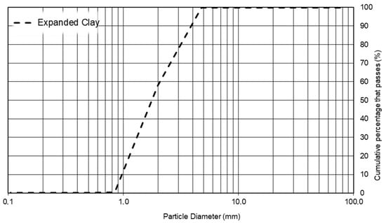 Expanded clay with a size range of 0–4 mm was used as aggregate material (Figure 1) for the production of the specimens analyzed in this work. Granulometric analysis was performed to characterize this granular material in terms of the distribution of its particles as a function of its size. The grain size distribution, in accordance with EN 933-1 [37], is presented in Figure 2.