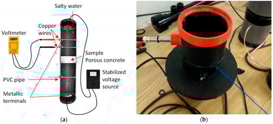 For the determination of the samples’ tortuosity, a laboratory experiment, based on the electrical conductivity of the sample and described in the work developed by Gerges and Balvedi [39] (see Figure 5a), was implemented and used. In this technique, the test specimen is mounted in a PVC tube that is closed by two electrodes. Next, the tube is filled with a conductive liquid (in this study, salty water) and a power supply generates an electric field between the two electrodes at the ends. Electrical potential differences in the water and sample make it possible to determine the tortuosity of the porous concrete sample.