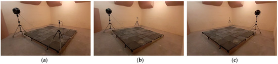 Experimental setup according to ISO 354 [18] with the porous concrete sample placed on the floor of the reverberant room (type A mounting): (a–c) different source and microphone positions are observed.
