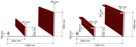 In this work, an attempt was made to understand whether the calculation and simulation models allow taking into account, adequately, the presence of different types of noise barriers, including reflective and absorbing barriers, as well as traditional (tall) and low-height barriers (with about 1.5 m). For barriers with an absorbing surface, the properties of the porous concrete material with expanded clay analyzed before, and with a thickness of 0.08 m [41,42], were considered. Different scenarios were simulated, considering a simple reference configuration without any acoustic barriers, and then the same scenario with the presence of acoustic barriers with heights of 1.5 m and 4 m. The distance between the barriers and the noise source varies according to their height, with the low-height barriers being positioned 2.83 m from the source, and the traditional tall barriers 7.5 m from it. These distances were defined assuming a possible railway track as the emitting source, and so these distances, for the first case, were based on a minimum allowable distance between the track and the barrier (maintaining the safety conditions), and for the second case, they were defined based on common distances adopted in the railway infrastructures in Portugal [43]. Two different barrier shapes were considered, one of them vertical and the other a L-shaped barriers, and cases with and without an absorbing layer were tested. Figure 9 presents a schematic representation of these configurations.