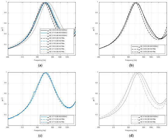 The adjustment procedure proposed above has then been used to fine-tune the macroscopic parameters, in order to obtain a better match of the sound absorption estimated using the Horoshenkhov–Swift model with the one measured using the impedance tube. One should note that only small variations were allowed, with a maximum of 10%. Observing the adjusted values of the macroscopic parameters, it is possible to note that the larger changes occur in the tortuosity values, which reached almost 10% in two of the sets. It should be mentioned that the test method used, based on the electrical conductivity of the sample, can pose some challenges in laboratory implementation and can present variations from specimen to specimen. As for the porosity and airflow resistivity, only the sample type AE 5.18 required more significant adjustments, while the remaining only required minor adjustments. The same occurred for the average pore size standard deviation, although in this case, the initial value was just fixed based on the literature.