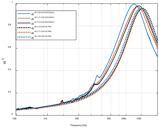 In Figure 12 and Figure 13, the experimental and theoretical sound-absorption coefficient curves in diffuse field conditions are presented for the mixture AE 5.18. The theoretical simulation and the experimental results were obtained for all scenarios using a thickness of 8 cm.