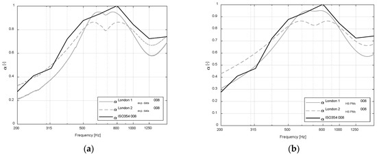 When comparing the various methods for estimating diffuse field sound absorption, London’s Equation 1 (London 1 exp.data 008 and London 1 HS PMc 008) appears to fit the experimental curve more closely, particularly the one produced using the Horoshenkov–Swift model and the adjusted macroscopic properties of the examined material. Although it predicts greater values at lower frequencies and smaller absorption values in the mid-frequency region, the second London equation also yields findings that are comparable. It should be emphasized that the predicted diffuse field absorption using London’s equations is merely a rough estimate and should not be used for anything other than the analysis of locally reacting materials. Since the tested solution, in this scope, is obviously bulk-reacting, considerable variations take place. Additionally, the diffuse field laboratory test was performed on a finite 3 × 3 m2 panel, although all equations apply to infinite panels, thus resulting in different behavior of the whole solution (see [36]).