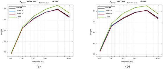 Sound pressure levels calculated using the CadnaA CNOSSOS-EU methodology, with the sound absorption obtained experimentally (ISO 354), through the London equations (London 1 and London 2) and reflective reference surface (α 0.01), at 0.25 m from the noise barrier: (a) for the 1.5 m height barrier; and (b) for the 4 m height barrier.