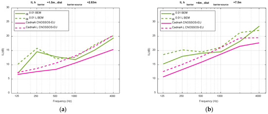 Insertion loss curves calculated with Cadna A CNOSSOS-EU and BEM methodologies. Comparisons for reflective barriers, with heights of: (a) 1.5 m and (b) 4 m.