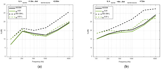 Insertion loss curves calculated with the BEM methodology, for reflective barriers (α 0.01 and α 0.01 L) and for barriers with an absorbing porous concrete layer (ISO 354 and ISO 354 L), with heights of: (a) 1.5 m and (b) 4 m.