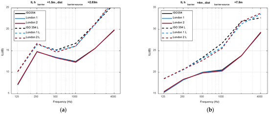 Insertion loss curves calculated with the BEM methodology, with the porous concrete sound absorption derived from ISO 354 experimental test, and London 1 and London 2 equations, for noise barriers with heights of: (a) 1.5 m and (b) 4 m. Dashed curves correspond to L-shaped cantilevered barrier, and continuous lines to a vertical barrier.